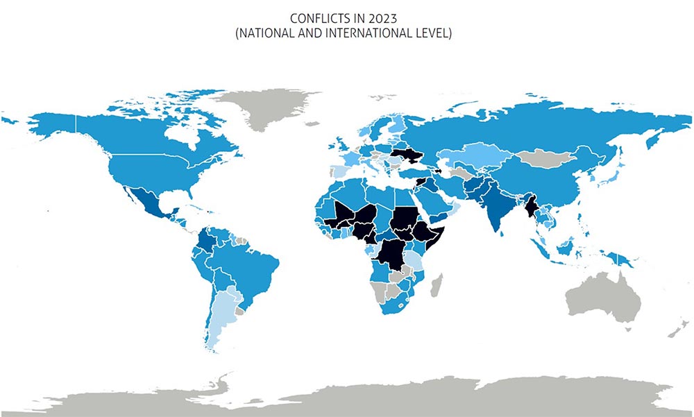 Definir QUÉ es un conflicto responde a numerosos matices, es decir, se trata de un concepto que va más allá delenfrentamiento armado entre dos partes. El HIIK (Heidelberg Institute for International Conflict Research), un instituto independiente que investiga y analiza conflictos políticos internacionales adscrito al Departamento de Ciencias Políticas de la Universidad de Heidelberg (Alemania), publica desde hace más de tres décadas el Barómetro de conflictos a nivelmundial. Este documento clasifica los conflictos en cinco categorías: “disputa; crisis no violenta; crisis violenta; guerra limitada y guerra”. El registro medio del último lustro supera los 300 conflictos por año, siendo más de 200 catalogados como conflictos violentos y con una media de más de 40 guerras abiertas en todo el mundo. Probablemente, cualquierciudadano medio que se informe a través de losprincipales canales españoles de prensa, radio o TV tendría dificultades para identificar más de 5 guerras en curso.